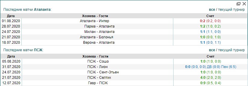Парижане уже много лет являются европейской сверхдержавой, но за это время так и не сумели ни разу попасть в четверку сильнейших команд Европы. Сегодня у них есть все шансы пробить линию сопротивления. После возобновления футбола во Франции подопечные Томаса Тухеля сыграли 2 официальных матча, выиграв 2 турнира — Кубок Франции и Кубок Французской Лиги. Команда должна быть в хорошей физической форме, потому что у нее не было такого изматывающего отрезка во внутреннем первенстве, как у её противника. Во то время, как в июне-июле «Аталанта» рубилась в Серии А, ПСЖ отдыхал, планомерно готовясь к решающим матчам. Помешать пройти дальше столичным футболистам может некий ментальный блок четвертьфинальной стадии. Они впервые забрались так высоко с сезона 2015/2016, а в полуфинал и вовсе не пробивались 25 лет. Не все гладко и с составом. Игру пропустят дисквалифицированный Анхель Ди Мария и травмированный Марко Верратти. Что касается Килиана Мбаппе, то по словам Томаса Тухеля, он будет в заявке на матч, если не случится ничего экстраординарного. Тем не менее, Париж является фаворитом противостояния.