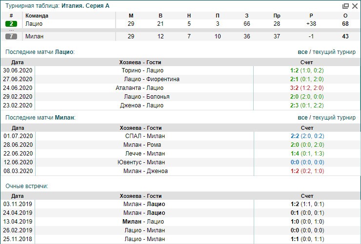 - Забитые голы: «Лацио» 195 (в среднем 1.15 за игру), «Милан» 260 (в среднем 1.53 за игру)