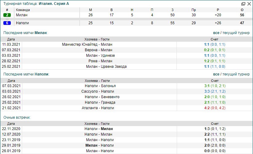 В 2021 году «Милан» выступает не так удачно, как в 2020. Несмотря на пятиматчевую беспроигрышную серию, «россонери» победили лишь дважды в последних восьми играх с учетом всех соревнований. «Наполи», напротив, начал набирать форму в последние недели. Команда Дженнаро Гаттузо имеет беспроигрышную серию из четырех игр во всех турнирах.