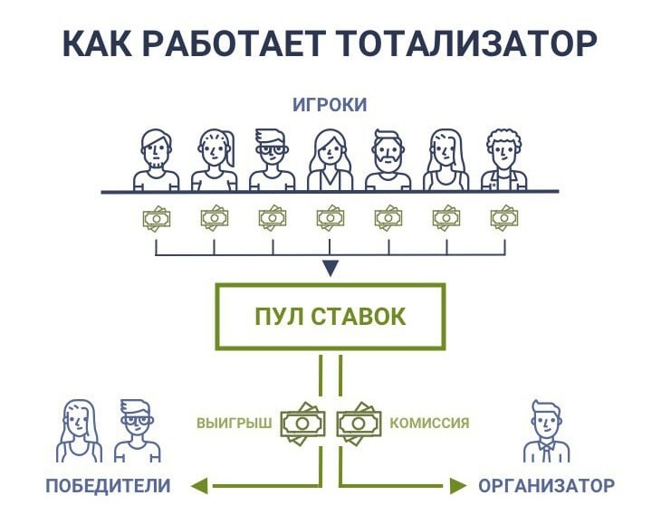 Суть работы ТОТО очень проста. Призовой пул складывается из ставок участников тотализатора. Как правило, 10% от пула забирает себе букмекерская контора в качестве комиссии. Далее, после завершения всех спортивных событий из тиража букмекер распределяет оставшуюся часть призового пула среди участников, угадавших хотя бы минимально необходимое количество исходов. Чем больше событий угадал игрок, тем бОльшую часть от призового пула он получит. Иногда в спортивных тотализаторах встречается джекпот для счастливчиков, угадавших все события.