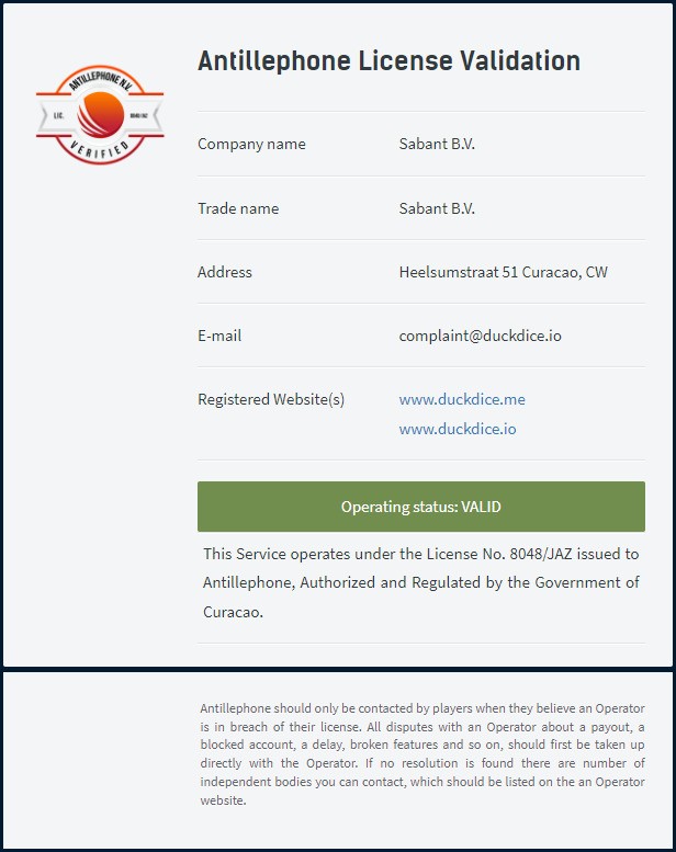 В отличие от страницы проверки, на официальном бланке сублицензии от Antillephone N.V. указывается регистрационный номер сублицензии. Он состоит из номера генеральной лицензии 8048/JAZ и присоединенных к нему значений: года выдачи сублицензии и порядкового номера выдачи в течение этого года. В частности, интернет-портал для игры в кости на криптовалюту DuckDice имеет сублицензию от Antillephone N.V. №8048/JAZ2018-018. Также на этом бланке прописываются ключевые характеристики и дополнительные детали соглашения. Внизу ставится личная подпись управляющего директора и фирменная печать лицензиата.