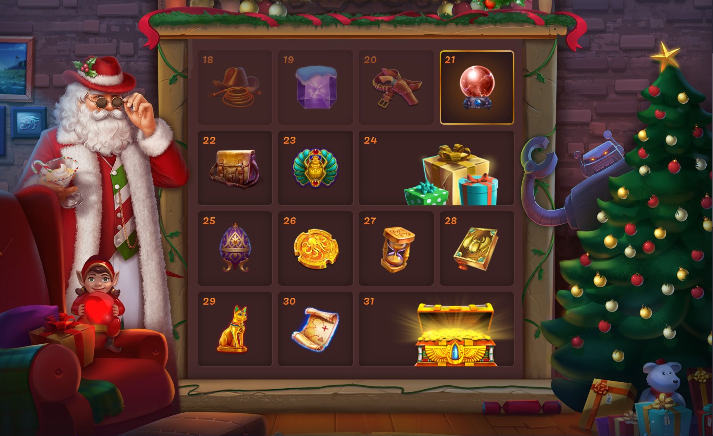 🔥 Следите за календарём на официальном сайте Slot Hunter и получайте бонусы в виде бесплатных турниров, денежных призов и фриспинов ежедневно! Каждый день вплоть до наступления 2021 года под ёлкой Вас будет ждать новый подарок. А в Католический Сочельник (24 декабря) и Канун Нового года (31 декабря) призы будут особенно ценными!