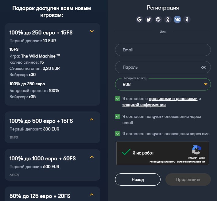Франк Казино славится тем, что регистрация в нём сверхбыстрая и занимает не более 15 секунд. Процесс регистрации максимально прост и удобен для пользователя, как и навигация по всему сайту. Чтобы приступить к созданию аккаунта, необходимо зайти на официальный сайт Франк Казино и в правом верхнем углу нажать на кнопку Регистрация. После этого откроется окно с регистрационной формой. На первом шаге необходимо указать только страну проживания. Далее Вам нужно будет выбрать один из трёх вариантов бонуса на первый депозит и заполнить несколько полей если Вы хотите зарегистрироваться через электронную почту. Альтернативный способ — воспользоваться существующим профилем в популярных социальных сетях Facebook, Google, Twitter, Mail.Ru, ВКонтакте, Одноклассники и Яндекс. При выборе классической процедуры регистрации потребуется: