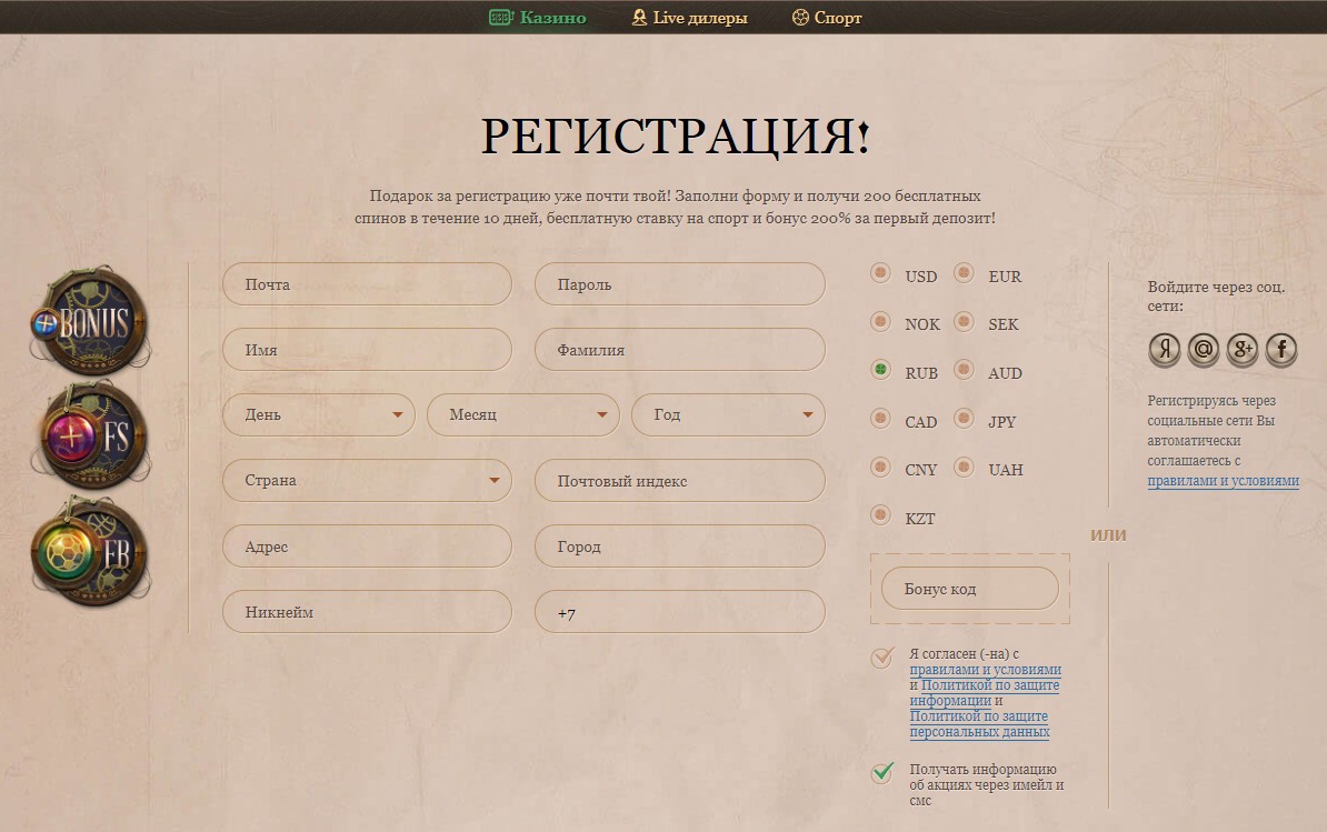 В этом онлайн-заведении можно играть и бесплатно, но это не так интересно и не приносит никакой практической пользы. Чтобы начать играть на реальные деньги, необходимо зарегистрироваться в клубе. Регистрация в JoyCasino крайне проста и занимает лишь несколько секунд. Первое что нужно сделать — это зайти на официальный сайт или зеркало JoyCasino. Далее, в левом верхнем углу нажать на оранжевую кнопку [Регистрация]. После этого откроется страница, на которой Вам нужно будет заполнить достаточно стандартную форму, выбрать валюту счета, ввести проверочный код и нажать на зеленую кнопку [Регистрация] чуть ниже. Более того, в JoyCasino есть быстрая регистрация через популярные социальные сети.
