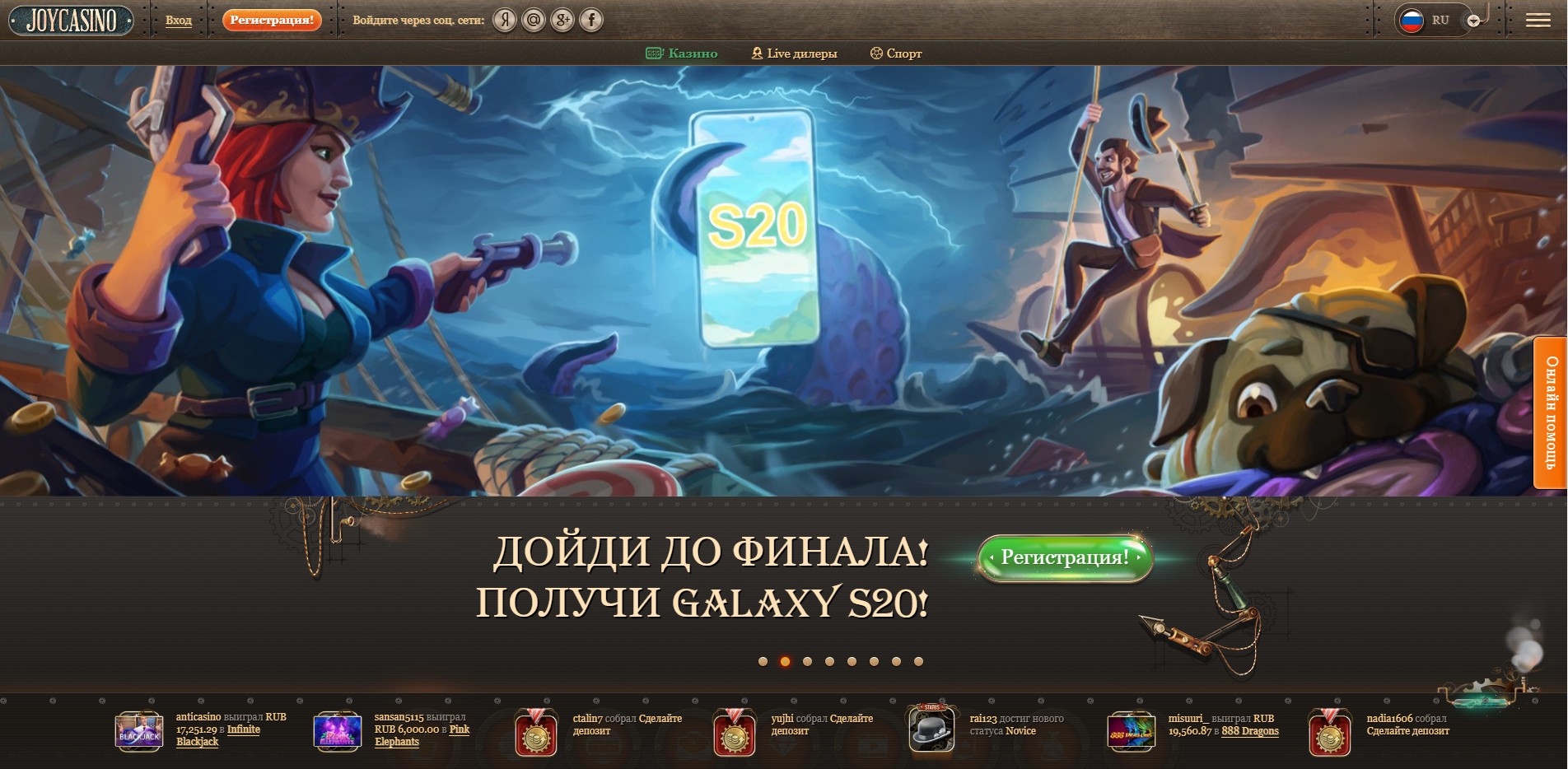 В наши дни, в эпоху современного и элегантного дизайна, где во главу угла ставится простота, весьма необычно наткнуться на казино, основанное на одной эпохе или теме. Прежде всего этим JoyCasino и выделяется на фоне однообразных игровых клубов. Официальный сайт ДжойКазино выполнен в винтажном стиле стимпанк. Если Вы думаете, что стимпанк предназначен только для музыки и искусства, Вы ошибаетесь. Он отлично подходит и для индустрии азартных игр. Обретя вдохновение в подлинной атмосфере этого ретро-футуристического феномена, JoyCasino мгновенно начало привлекать внимание своим уникальным внешним видом. После перехода на официальный сайт JoyCasino Вам покажется, что Вы попали в какой-то другой мир. Здесь обитают главные герои слотов, отличные бонусы и счастливые игроки. Дизайн официального сайта действительно заманчивый. В первую очередь игроков встречает большой баннер с информацией об акциях, бонусах и интересных предложениях. Под этим баннером находится строка меню, в которой можно выбрать один из разделов для игры. Например, слоты или развлечения с живыми дилерами.
