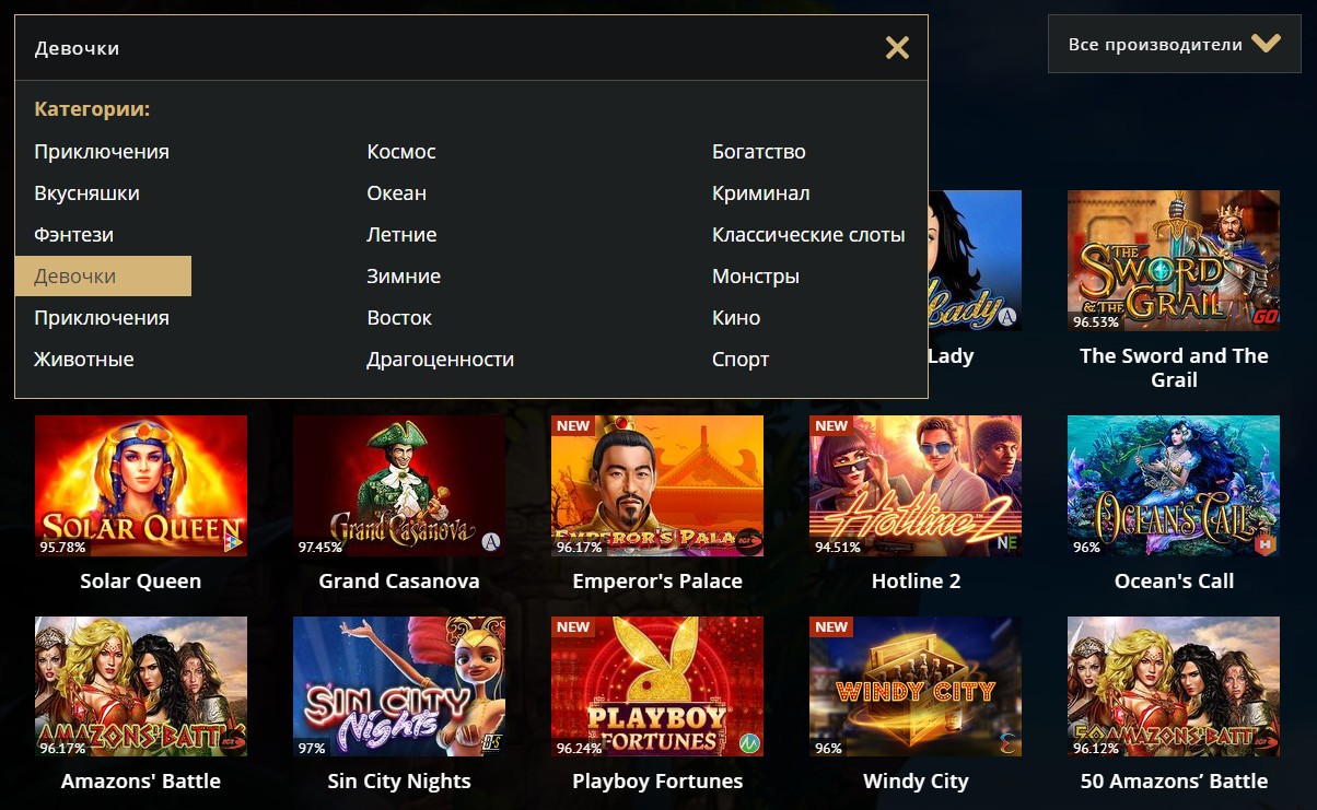 Видеослоты — самая многочисленная категория игр в онлайн казино RIOBET, насчитывающая несколько тысяч единиц. Для удобства клиентов они разбиты на рубрики в зависимости от популярности, новизны, наличия джекпотов и необычных особенностей. Более того, установив курсор в строку поиска, Вы откроете выпадающее подменю, в котором слоты отсортированы по жанрам.