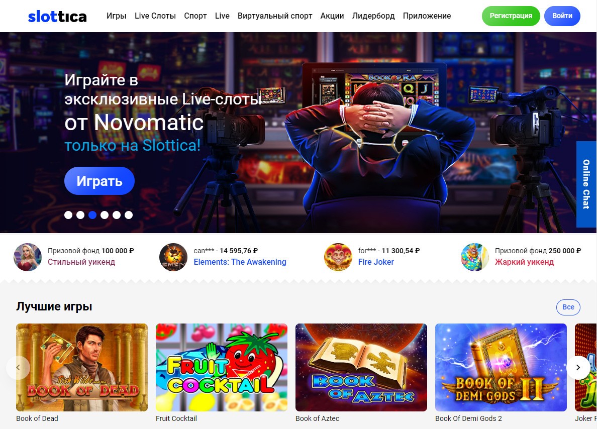 Зайдя на официальный сайт Slottica, Вы сразу же окунётесь в атмосферу спорта и азарта. Комбинация белого цвета и синих деталей, в которых выполнена главная страница, ассоциируется с динамичностью и мотивирует посетителей к активным действиям. На портале есть следующие разделы: Игры, Live Слоты, Спорт, Live, Виртуальный спорт, Акции, Лидерборд, Приложение.