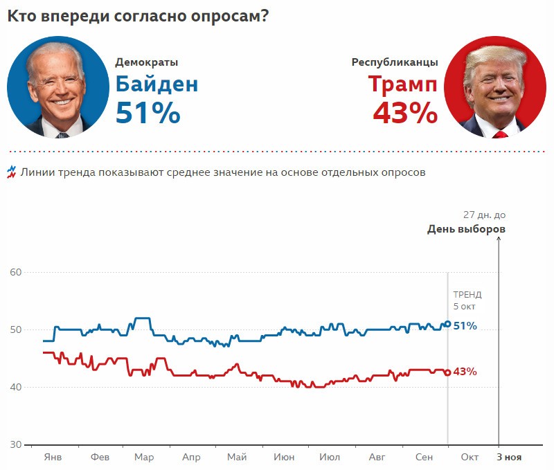 Фаворитом предвыборной гонки является Джо Байден. Согласно национальным опросам он опережал действующего президента большую часть года. В начале июня Байден был впереди на 12%. За лето Трамп несколько наверстал упущенное, и к началу осени отставание сократилось до 7%. Однако сентябрь и первые дни октября оказались более удачными для Байдена, который снова увеличил отрыв. Очень сильно ему помогло то, что у Трампа и его жены Мелании обнаружили коронавирусную инфекцию. 2 октября в своем Twitter глава государства написал, что сдал положительный тест на COVID-19. В настоящее время президент проходит лечение стероидным препаратом.